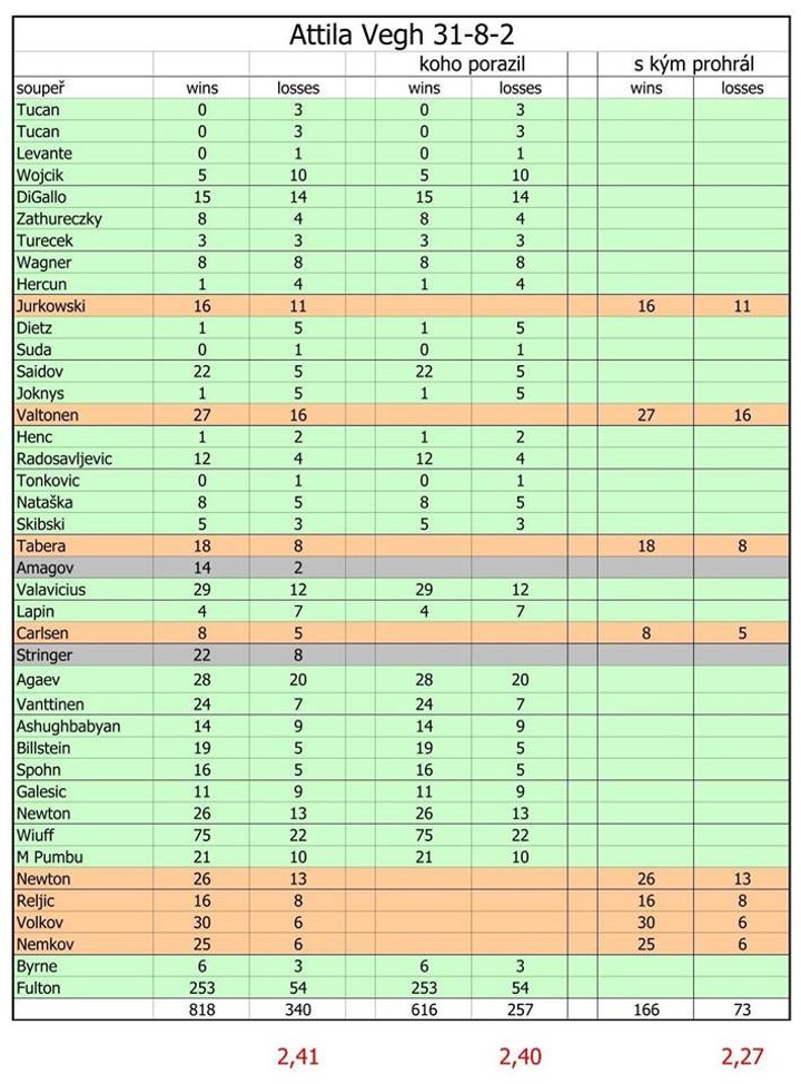 Na druhej strane tu máme Attilu Végha. Ten počas svojej kariéry oficiálne ´odbúchal´ 39 duelov, v ktorých sa radoval z výhry 31 krát a patrí mu rovnako pekný koeficient 3,8. Jeho súperi ale mali o dosť vyšší koeficient výhier oproti prehrám, a to 2,41, čiže si pri jednej prehre na konto pripísali 2 až 3 výhry.