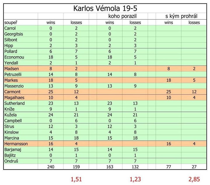 Zaujímavejšia je už ale štatistika výhier a prehier samotného Vémolu. Tá ukazuje, že ´Terminátor´ vyhral s bojovníkmi s koeficientom 1,23, čo je iba mierny náklon na stranu výhier. S kým mal ale Vémola problémy sú bojovníci s vysoko pozitívnym skóre. Svojich 5 prehier totiž Karlos zaznamenal s protivníkmi s koeficientom 2,85, čiže takmer 3 výhry k jednej prehre.