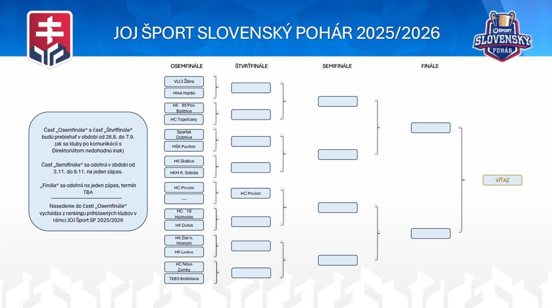 Joj Šport Slovenský pohár začína 28. augusta a jeho prvé dve kolá potrvajú do konca prvého septembrového víkendu. V hre následne ostane najlepšie kvarteto, ktoré sa pobije o trofej počas novembrovej respektíve decembrovej reprezentačnej prestávky. Známy je aj žreb. Extraligový nováčik z Prešova mal v osemfinále voľný žreb a má istotu miestenky v top osmičke. Zvyšné dvojice zahŕňajú žilinsko-martinské derby, súboj Dubnice s Púchovom či Humenného s Detvou.